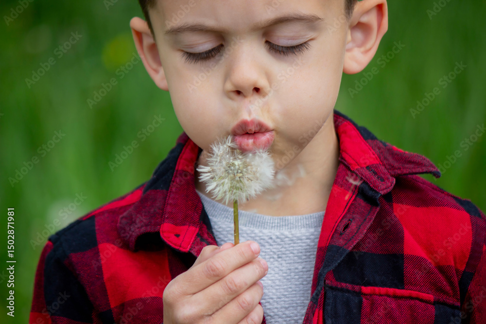 Boy blowing on a dandelion. Allergy.