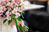 A close-up of a person holding a bouquet of fresh pink and white lilies with green leaves. The soft, blurred background highlights the vibrant floral arrangement, emphasizing its beauty and elegance