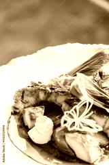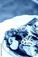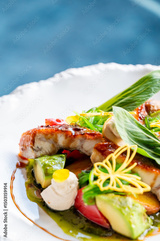 A gourmet dish with grilled fish, avocado, and vibrant garnishes, including green leaves and yellow edible flowers, served on a white plate against a blue background.