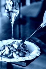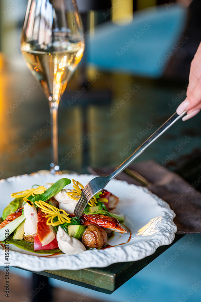 A gourmet dish featuring grilled meat, vibrant vegetables, and edible flowers on a white plate, complemented by a glass of white wine. A hand holding a fork adds elegance to the fine dining experience