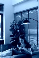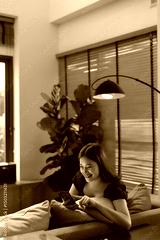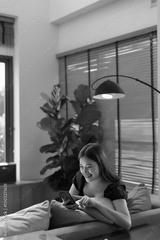 Asian woman smiling while using a smartphone on sofa Indoor scene showcasing modern living space and potted plant in the background