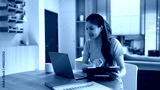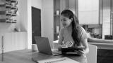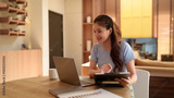 Happy Asian Woman Working Laptop Tablet at Home Office
