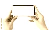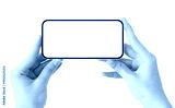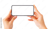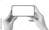Person holding mobile phone in hand, blank white screen mockup on transparent background