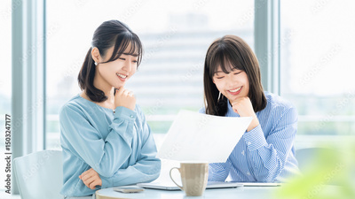 資料を見ながら笑顔で話す2人の女性・ビジネスウーマン