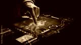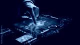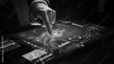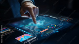 Business professional interacting with futuristic digital data interface using touch gestures in a dark environment showcasing advanced technology and analytics
