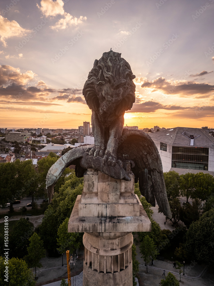 Beautiful aerial view to lion statue over monument in downtown