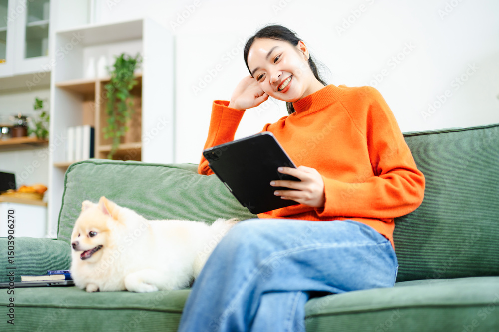 Asian woman using a tablet while relaxing on a sofa with her pomeranian dog. Cozy digital lifestyle at home with comfort, tech