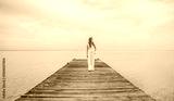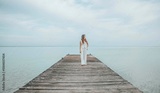 Asian woman standing barefoot on a wooden pier, gazing into the distance over a calm sea horizon, dressed in a white outfit under a pale cloudy sky, mindfulness, wellness retreat, travel blog