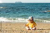 Baby playing on vacation in the sand at the beach wearing a UV sun protection t-shirt
