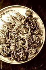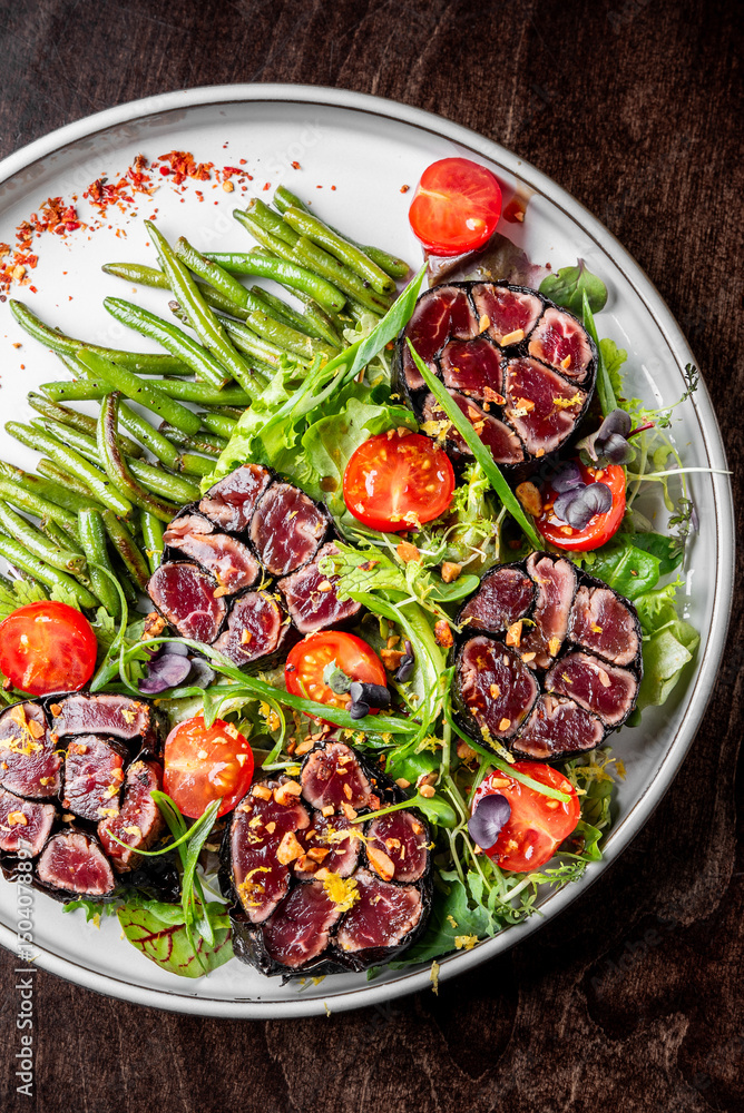A gourmet salad with seared tuna, fresh green beans, cherry tomatoes, mixed greens, and crushed nuts, elegantly presented on a white plate against a dark wooden background