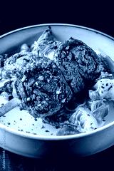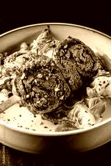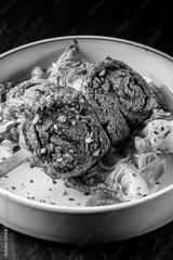 Grilled beef rolls stuffed with vegetables and spices, served on a white plate with fresh basil garnish. Vibrant colors and textures create a gourmet culinary presentation.