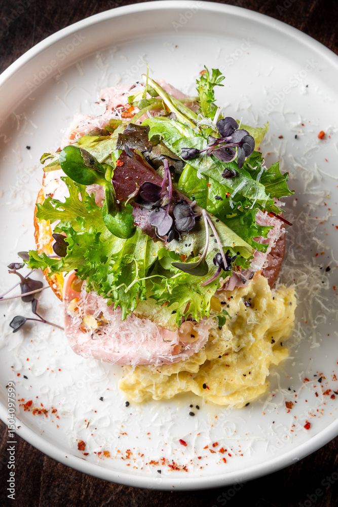 A gourmet dish with creamy scrambled eggs, thinly sliced ham, mixed greens, microgreens, grated cheese, and seasoning, elegantly plated on a white plate