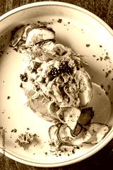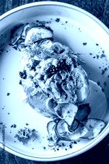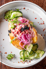 Baked potato with minced meat, pickled onions, black caviar, fresh dill, and cucumber slices, garnished with parsley and chili flakes, served on a white plate