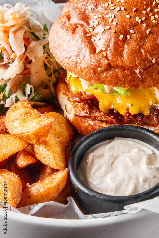 Close-up of a delicious burger with melted cheese, fresh lettuce, and savory sauce in a sesame seed bun, accompanied by crispy potato wedges and a creamy dipping sauce