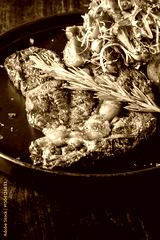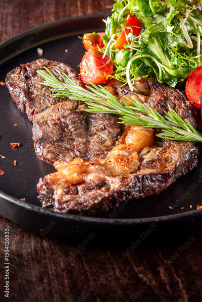 Juicy grilled steak with rosemary, served with a fresh mixed greens and cherry tomato salad on a black plate, placed on a dark wooden table. Rich colors and textures highlight the dish.
