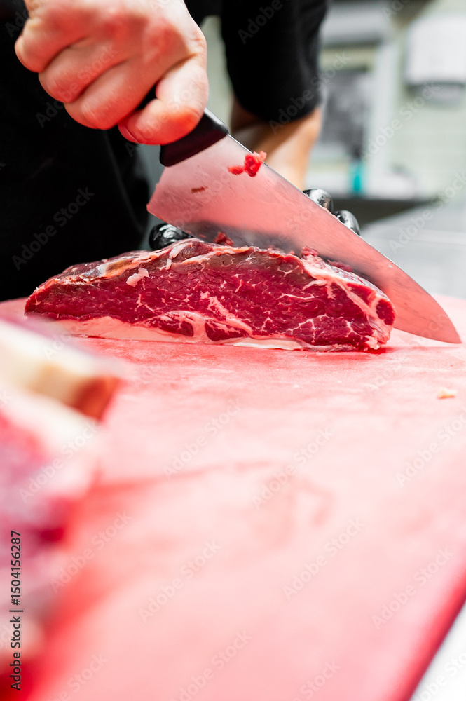 A hand slices fresh raw beef on a red cutting board with a sharp knife. The close-up highlights the marbling, texture, and preparation process, ideal for culinary and food industry themes