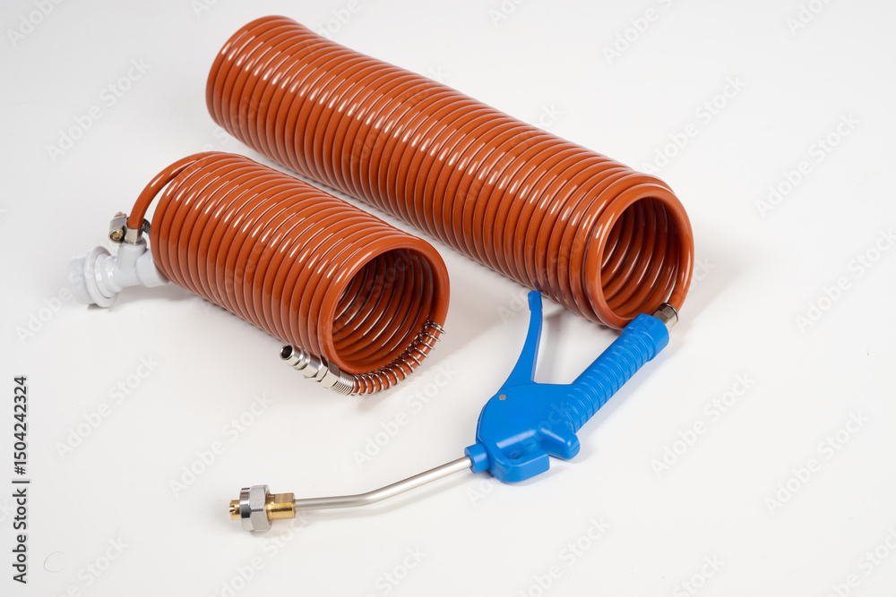Blue air blow gun with long nozzle connected to two coiled pneumatic hoses, used in industrial workshops for cleaning and maintenance. Repair. Workshop. Industry.