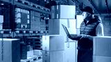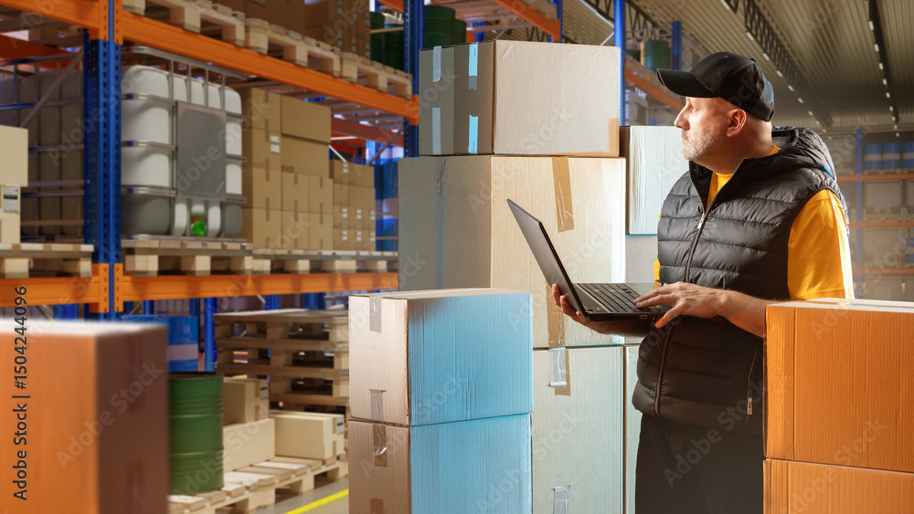 Man warehouse supervisor. Guy with laptop in storage area. Supervisor standing inside warehouse. Man inspecting boxes in industrial warehouse. Logistics center supervisor career concept