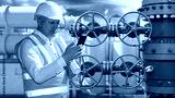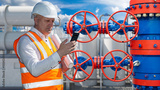 Man plant engineer. Guy is engineer on territory of factory. Worker with phone inspects gas station. Factory with oil and gas equipment. Man engineer near tanks and valves. Industrialist in uniform