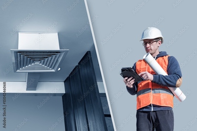 Man ventilation equipment specialist. Designing vent shafts in building. Man engineer with e-tablet. Worker services air conditioning equipment. Ventilation infrastructure inside building