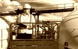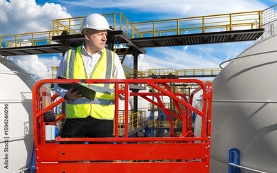 Man industrial engineer. Specialist outside chemical factory. Man oil refinery contractor in lift basket. Industrial engineer in service uniform. BPVC around industrialist. Gas processing industry