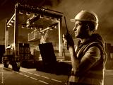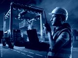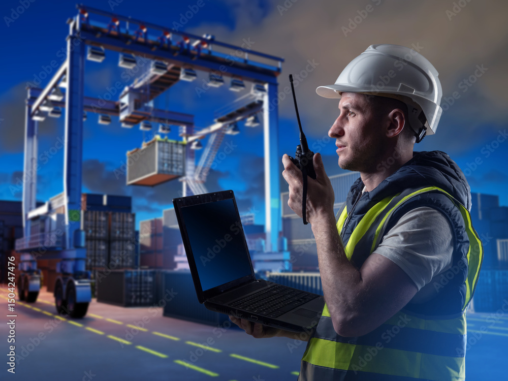 Man in container logistics port. Worker with walkie-talkie and laptop in hands. Portrait man logistician near gantry crane. Territory container warehouse in evening. Customs officer in helmet in port