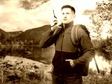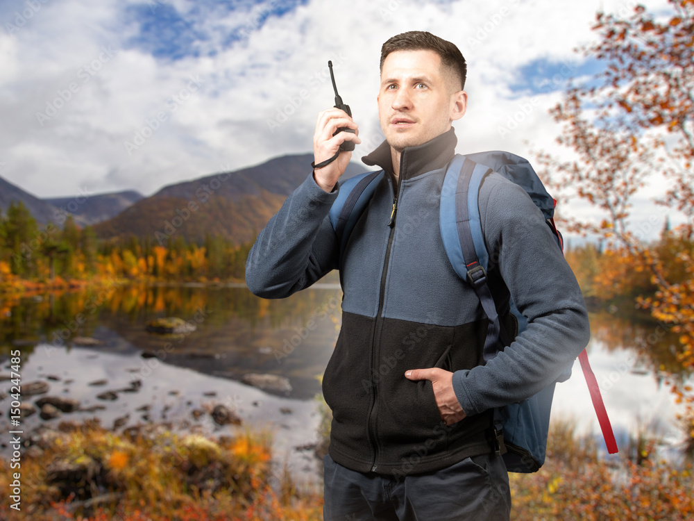 Man traveler during hike. Guy tourist with walkie-talkie in his hands. Hiking tourism. Traveler near river in wild. Guy went on hiking trip in warm autumn weather. Man tourist with backpack