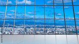 Cityscape behind panoramic windows. Interior of spacious room in skyscraper. Building with panoramic glazing view from inside. Summer cityscape under blue sky. View from skyscraper to megapolis