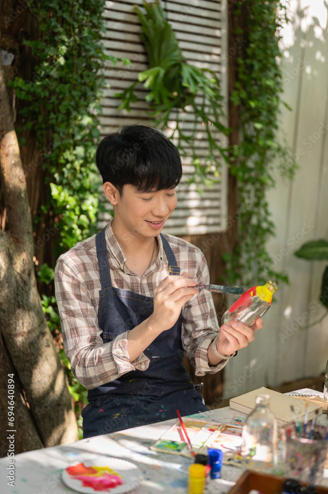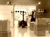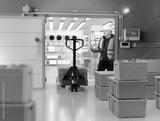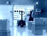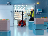 Man in industrial refrigerator. Worker with laptop works in warehouse with vegetables. Cold storage with pallets. Supervisor man in cold store. Industrial refrigerator with palletjack near gate.