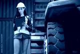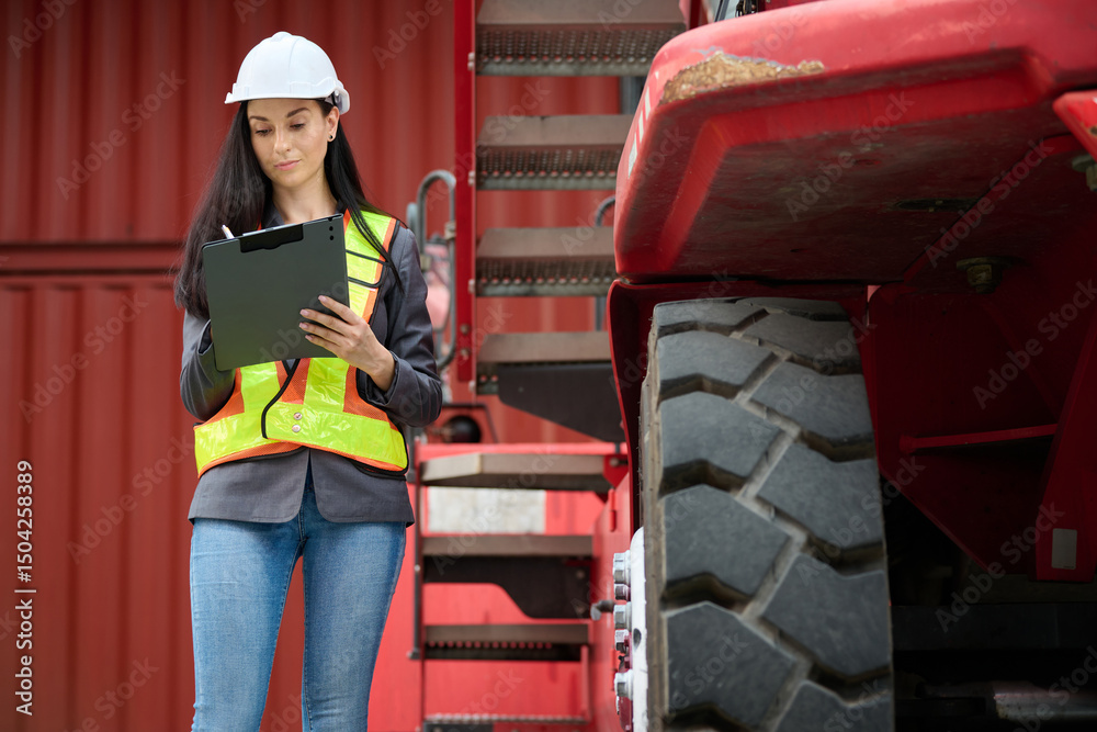 Engineer or worker checking solid rubber tire forklift in containers warehouse storage