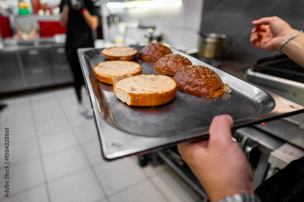 A person holding a tray with six burger buns, three of which are cut in half, in a commercial kitchen. Stainless steel countertop and professional kitchen equipment in the background