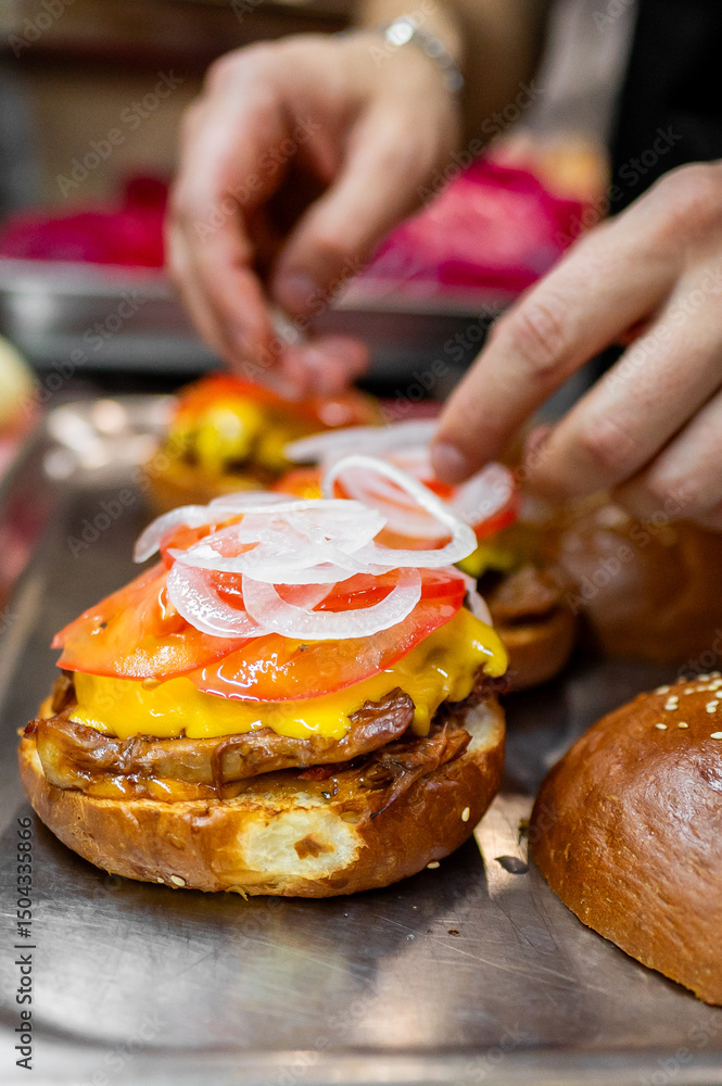 A chef's hands carefully assembling a gourmet burger with melted cheese, fresh tomato slices, and crispy onion rings on a toasted bun in a professional kitchen