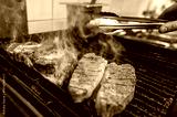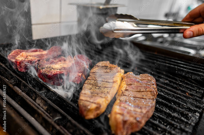 Grilled steaks sizzling on a barbecue, with smoke rising and a hand holding tongs, ready to flip the meat. A perfect depiction of outdoor cooking and juicy, flavorful beef.