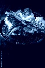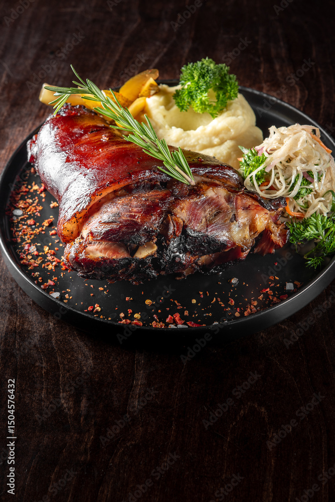 Roasted pork knuckle with crispy golden skin served on a black plate with mashed potatoes, sauerkraut, pickles, and garnished with fresh rosemary and parsley