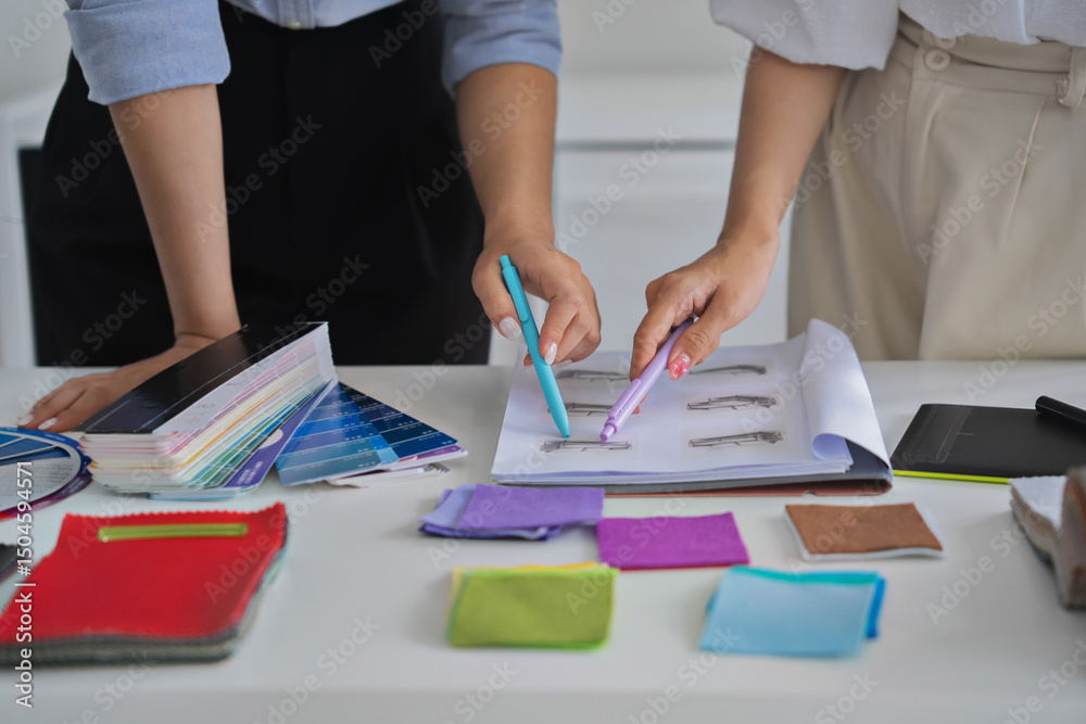 Designers reviewing office interior layout plan with paper drafts and material samples at shared desk