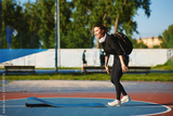 Young sportswoman bringing yoga mat on a sports field