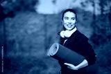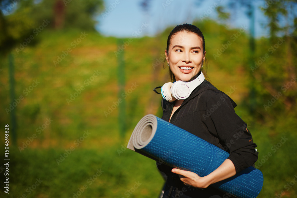 Sportswoman carrying yoga mat and headphones smiling in a park