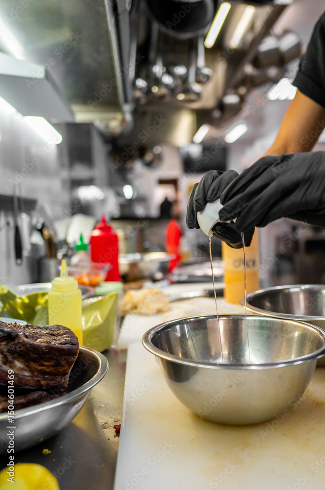 A professional chef wearing black gloves cracks an egg into a stainless steel bowl in a busy commercial kitchen, surrounded by ingredients, utensils, and condiments.