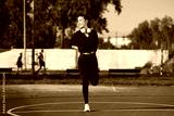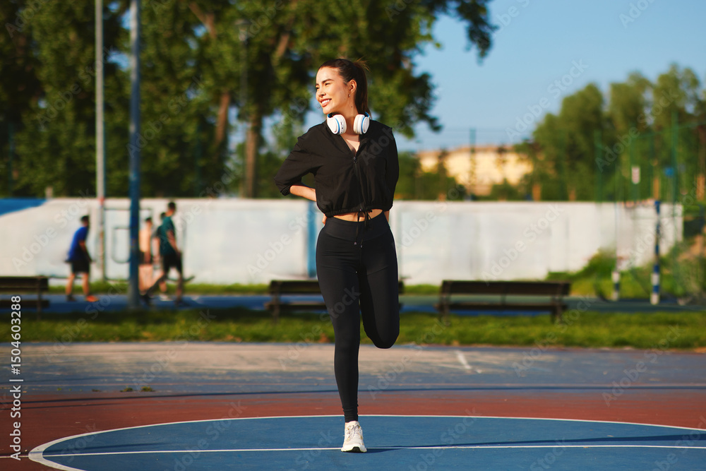 Sporty woman wearing headphones is warming up on a sports field, stretching her legs and smiling