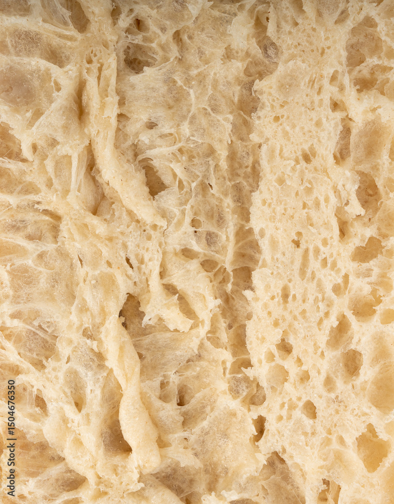 Focaccia flatbread slice macro texture, baked dough pattern. White bread loaf cut close up