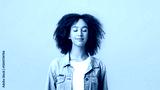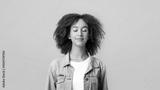 Meditating, relaxing, peaceful student blogger or freelancer. Calm pacified young african american lady with curly hair in sweater, with closed eyes prays or meditates, isolated on light background