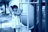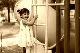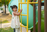 happy toddler girl playing and climbing on outdoor playground at park