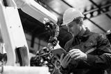 Robotic engineer automatic mechanic checking quality system of automation robot arms machine in factory. Service programming machinery welding robots in production at factory industry.