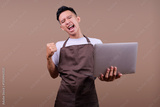 Excited Young Asian Male In Brown Apron Using Laptop While Celebrating Victory With Clenching Fist
