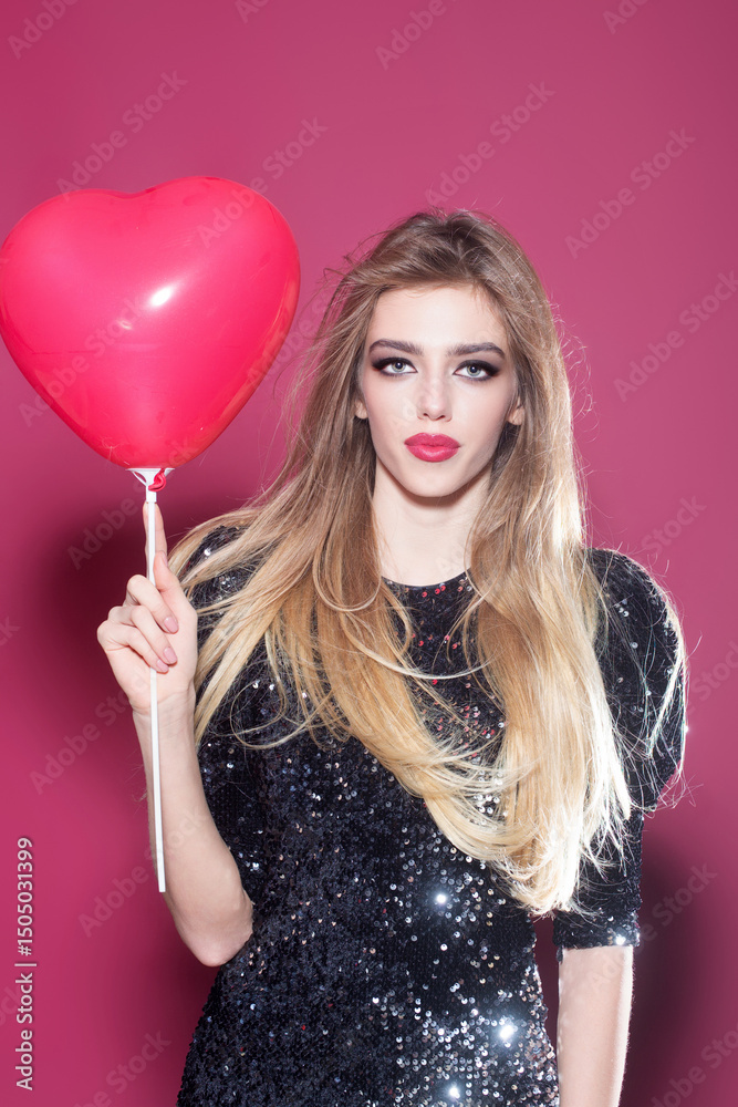 Woman holding a red heart love balloon. Beautiful female with a romantic present. Girl with a Valentine's Day heart. Love and romance. Woman celebrating Women's Day. Girl celebrating love and passion.
