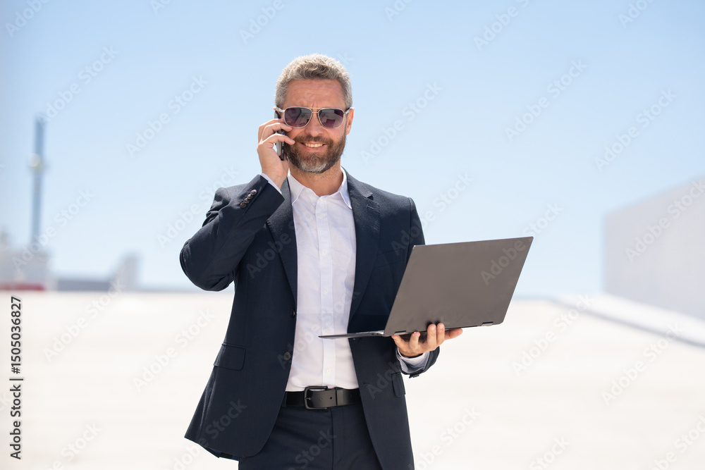 Businessman with phone and laptop outdoors. Mature businessman online business. Businessman with laptop. Business online. businessman checking data on laptop outside. Business man in suit work online.