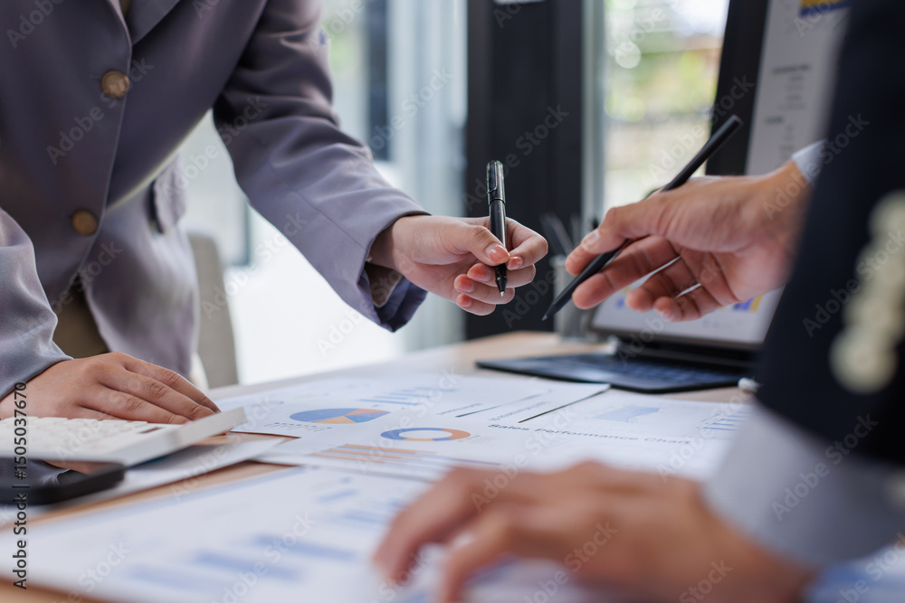 Financial Business Team analyze the graph of the company's performance to create profits and growth, Market research reports and income statistics, Financial and Accounting concept.