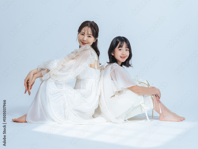 親子、ドレス、女性、女子、女の子、ポートレート、ファッション、おしゃれ、ヘルシー、笑顔、カメラ目線、全身、座る、寄り添う、仲良し、愛情、母の日、清楚、高級感、ラグジュアリー、ウェディング、ブライダル、小学生、日本人、かわいい、美人、美容、コピースペース、広告、キレイめ、カジュアル、ポジティブ、成長、子育て、育児、フォトスタジオ、写真館、記念撮影、ペア、ママ、母親、母子、娘、ビューティ、ボディケア、