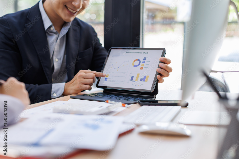Financial Business team analyze the graph of the company's performance to create profits and growth, Market research reports and income statistics, Financial and Accounting concept.