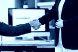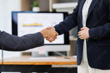 Happy young business woman asian manager handshaking client at meeting. Smiling female hr hiring recruit at job interview, insurance agent, lawyer making contract deal at work with business handshake.